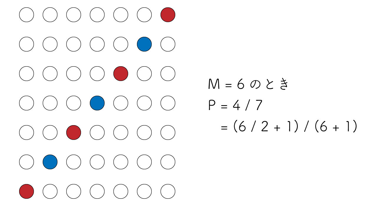 $m_i = 6$ の場合は下図の通り。 一般化すると、 $m_i$ が偶数のときは $p_i = \dfrac{m_i + 2}{2(m_i + 1)}$ となる。