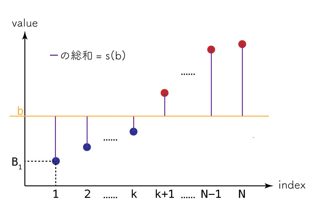 「最適な $b$ は $B_1 \sim B_N$ のどれかだろう」と目星をつければ、累積和を利用することで全探索が可能。具体的には $b = B_k$ の場合