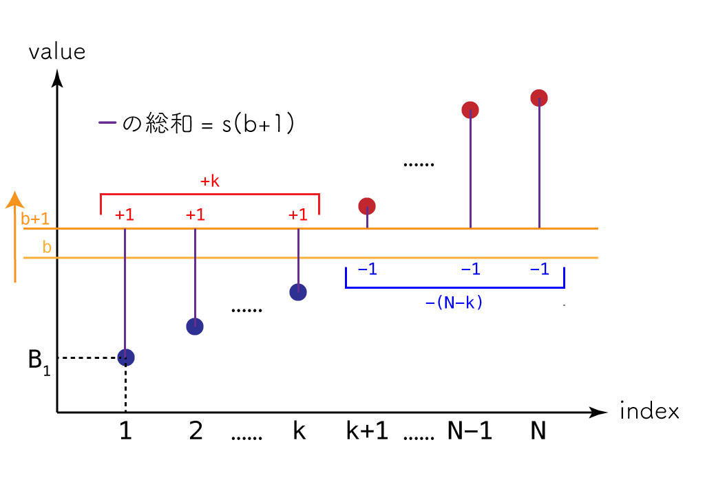 となるため、 $s(b+1) - s(b) = k - (N - k)$ となる。ここで $d(k) = 2k - N$ としておこう。