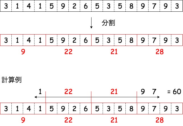 以下は長さ $16$ の数列の区間和を求める際に、平方分割を適用した例である。このように区間を「スキップする」感覚で、前計算 $O(N)$ で計算量を $O(\sqrt N)$ に落とすことができる。