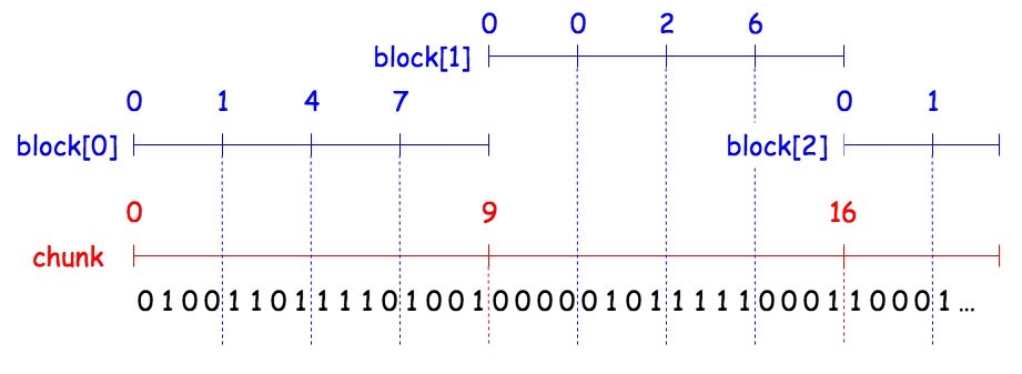 これと同様にビットベクトルも bit 列をブロックに分割するのだが、平方分割と違って 2 段階に分割する。