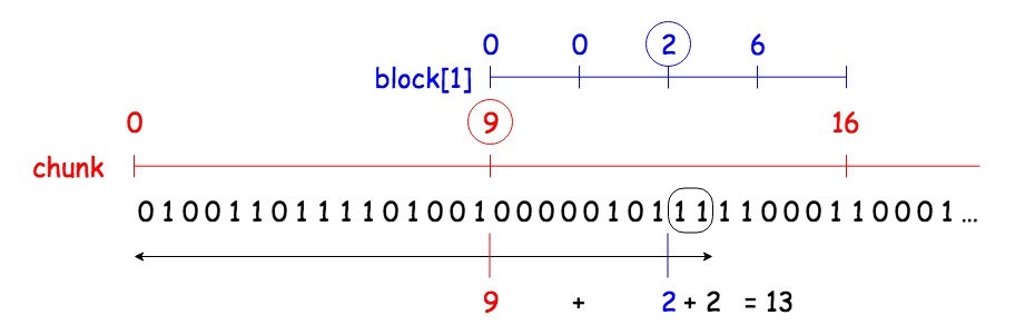 後に示すように、chunk と block の幅 $(c, b)$ は $((\lg N)^2, (\lg N) / 2)$ に設定すると、簡潔性が満たされる。 ただし実装する場合は、この幅を $N$ に応じて変えることまではしなくていい。想定している最大ケースに合わせればいいだろう。