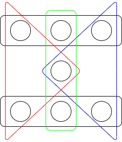 そうでない場合、 $m$ の小さい方から $U_i$ の選び方を全探索する。最大ケースは $(3, 3, 3, 3, 3)$ だが、これは以下のように $m = 7$ で達成できる。