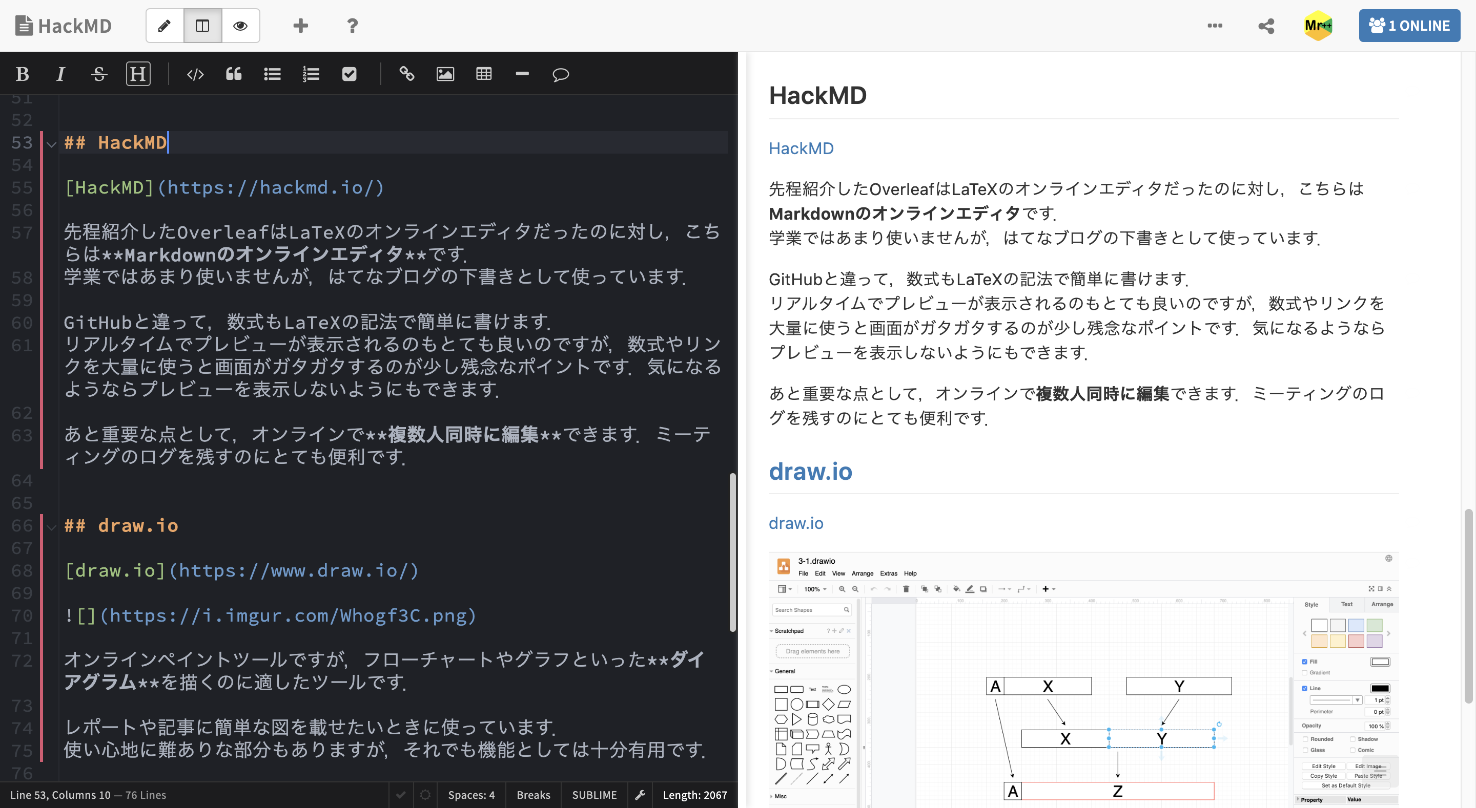 先程紹介した Overleaf は LaTeX のオンラインエディタだったのに対し,こちらは Markdown のオンラインエディタ です. 学業ではあまり使いませんが,はてなブログの下書きとして使っています.
